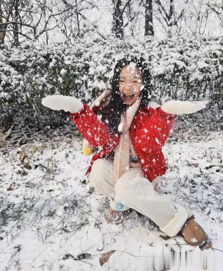她披散着长发,肉嘟嘟的脸蛋白里透红,一会儿蹲在雪地里扒雪,一会儿蹦跳着踩出小脚印,笑得眼睛弯成月牙,开心得完全停不下来。